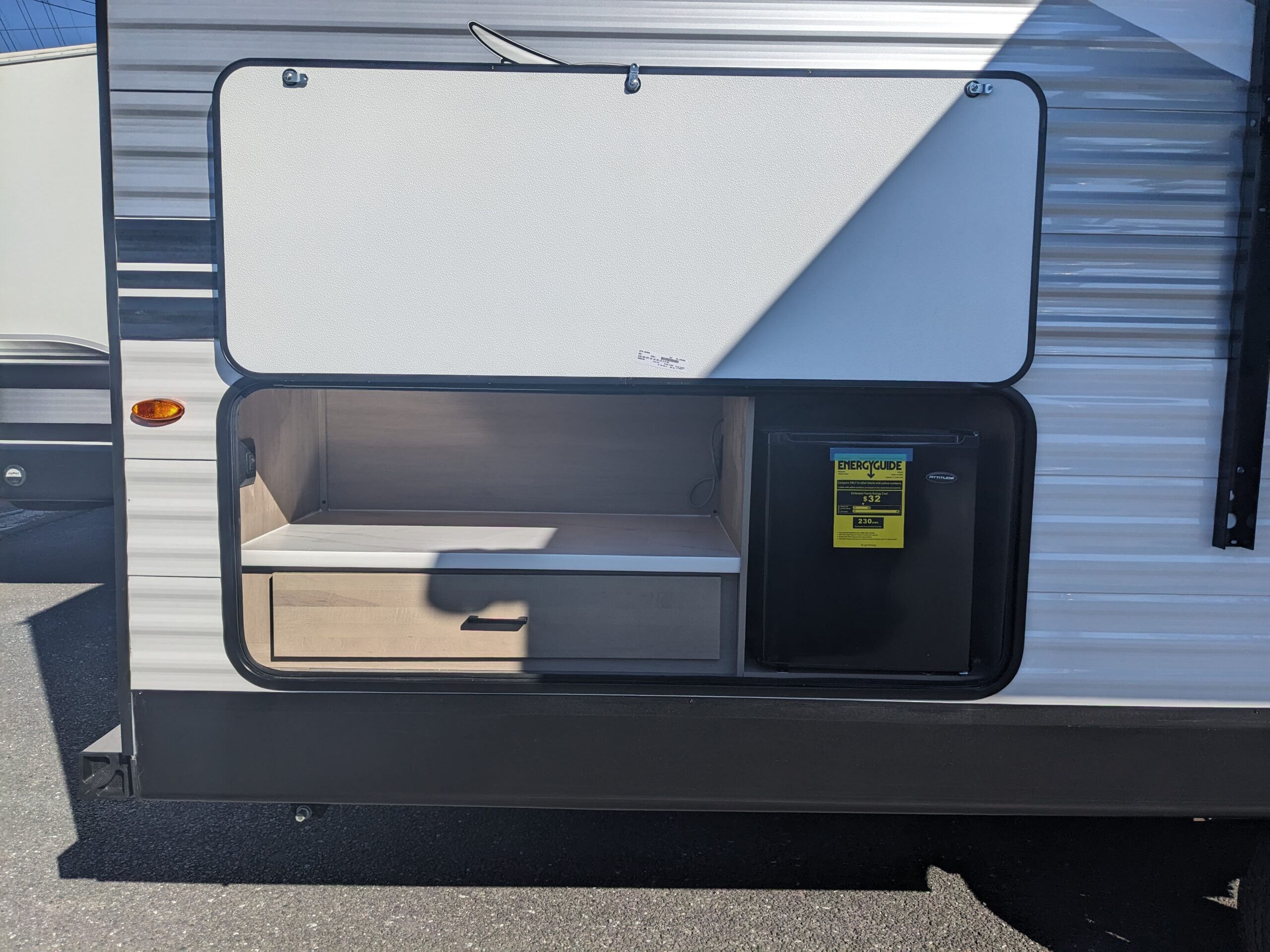 後方は簡易作業台と冷蔵庫を完備
